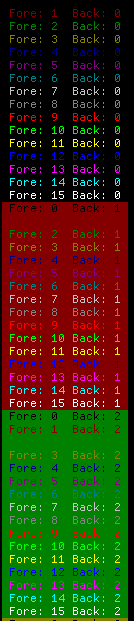 AnsiNote (ansicolor (fore, back), string.format (" Fore: %-2s Back: %s ", fore, back))