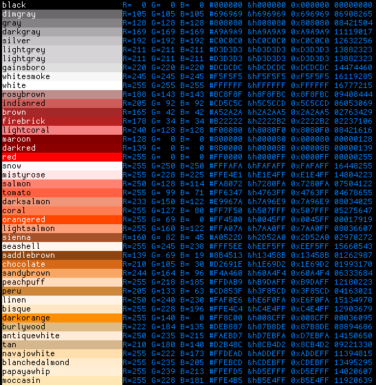 By the way, if you want to see what all the named RGB colours look like, you can type: /Debug 'colours'
